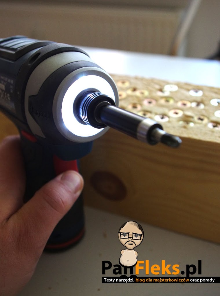 Warto także wspomnieć o wyposażeniu narzędzia. Na uwagę zasługuje np. bardzo sprytnie zrealizowane podświetlenie miejsca pracy. Tradycją stało się umieszczanie jasnych diod LED tuż pod uchwytem na osprzęt, albo w uchwycie na akumulator. Bosch wybrał inną drogę – inżynierowie zaprojektowali specjalny pierścień z diod LED umieszczony wokół końcówki na bity. Pozwala to na bardzo równomierne i dokładne oświetlenie miejsca pracy.