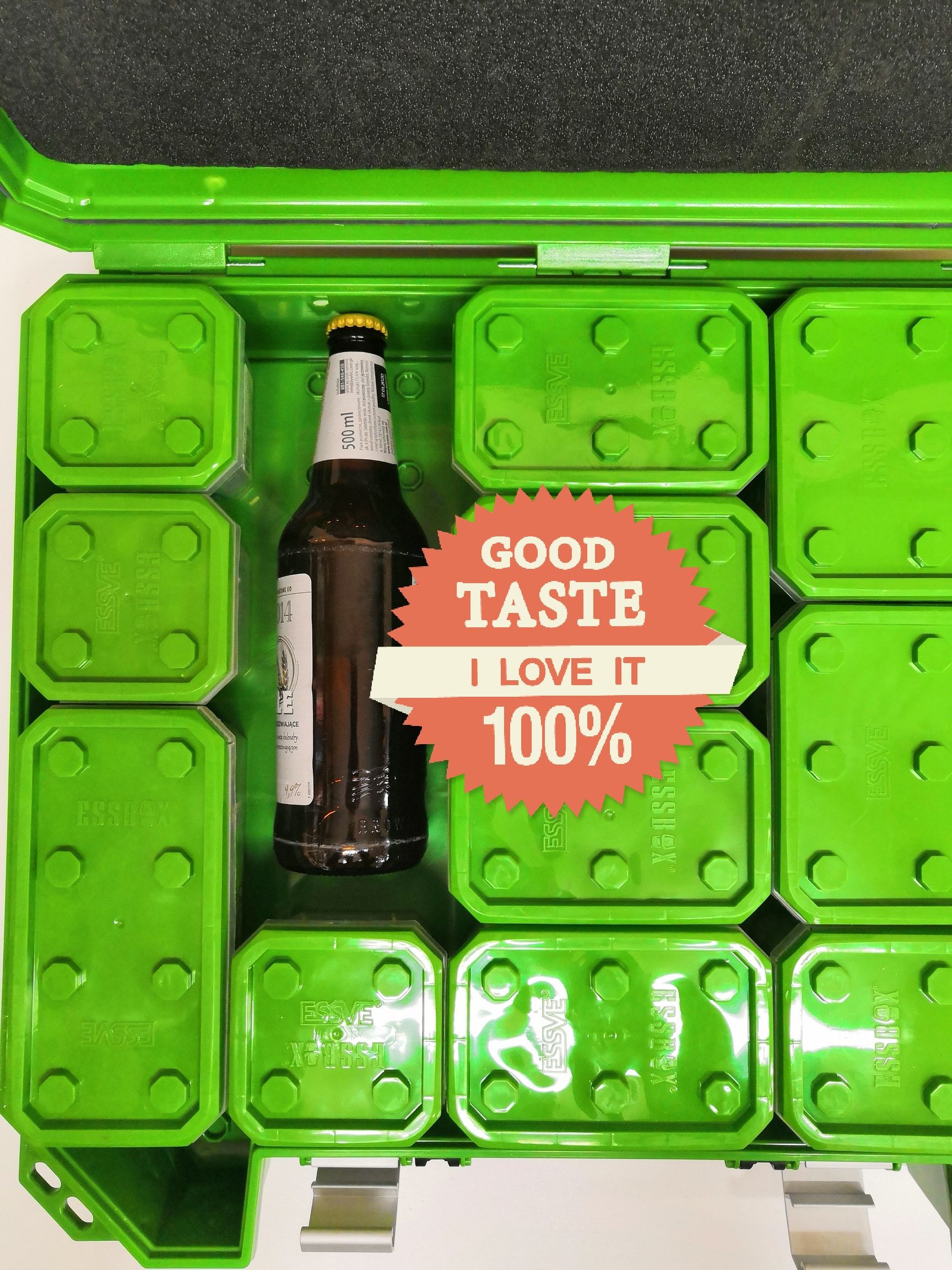 Na wspomniany system składa się kilka elementów. Pierwszym z nich jest walizka do przechowywania i transporotowania. Występuje w dwóch rozmiarach. Posiada specyficzne dno z wypustkami, uszczelkę, która sprawia, że walizka jest wodoodporna w klasie IP44 i solidne zatrzaski. Do walizki pasują pudełka Essbox – to pojemniki z przezroczystego tworzywa, w różnych rozmiarach, które można umieścić w walizce. W tych pudełkach pakowany jest cały dostępny asortyment, jaki w ofercie ma Essve: włącznie z klejami, chemią budowlaną, czy osprzętem.