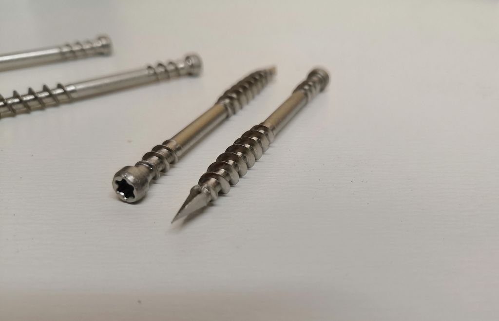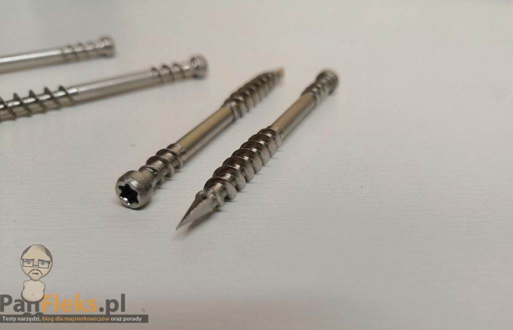 Wkręty wyposażone są w niepełny podwójny gwint, który umożliwia dociąganie deski do konstrukcji nośnej mimo zredukowania wymiaru łba. Łby są na tyle małe, że nawiercenie w krawędzi deski jest niemal niewidoczne. Kształt czubka wkrętu, w kształcie strzały – redukuje opory w materiale i ryzyko rozszczepienia deski.