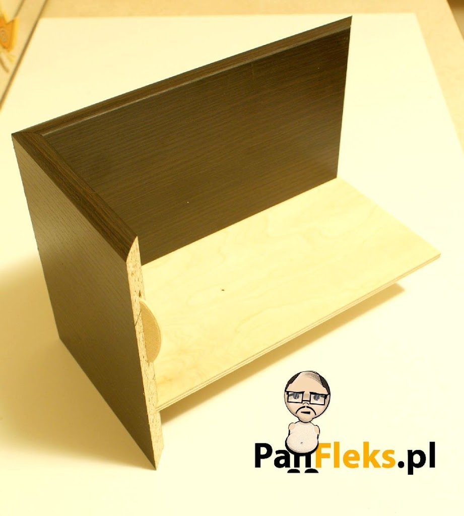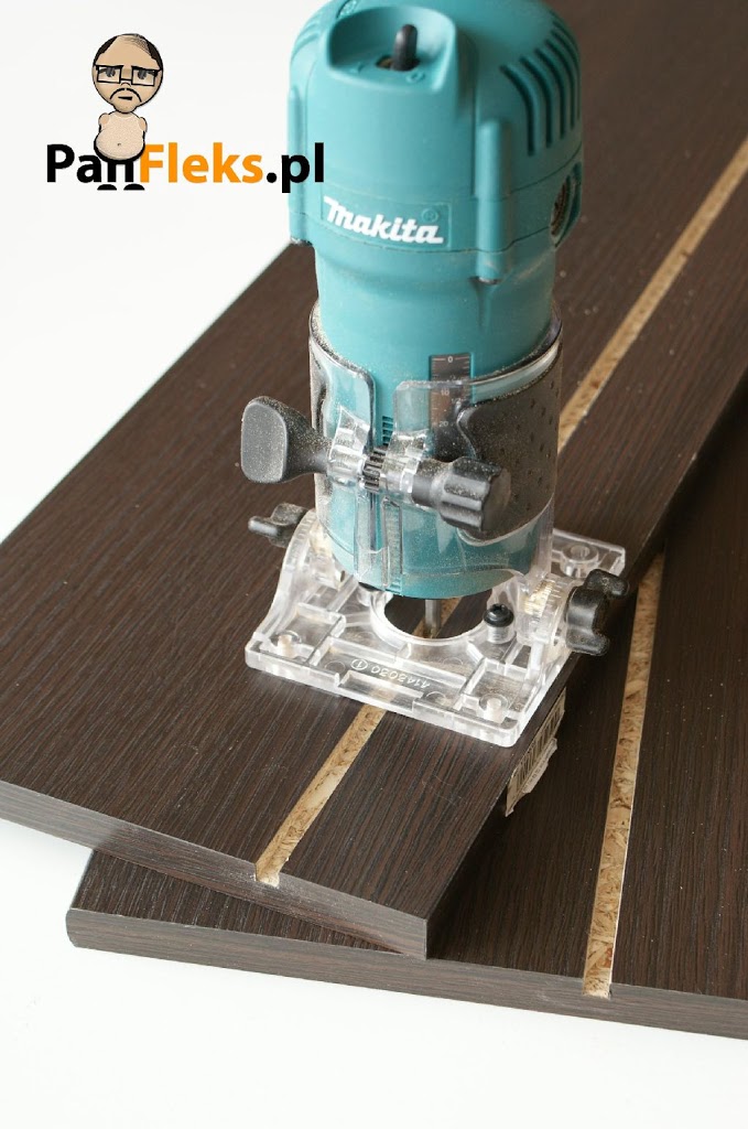 Rowek pod dno donicy najłatwiej wykonać frezarką – tutaj polecam narzędzie, którego opis znajdziecie w jednym z poprzednich postów – nadaje się do tej pracy wyśmienicie, bo można obsługiwać je jedną ręką, podczas gdy drugą unieruchamiamy półkę. Jeśli nie mamy dostępu do frezarki, dno można oprzeć o listewki przyklejone, bądź przykręcone po wewnętrznej stronie pudełka. Wykorzystana w projekcie półka jest oklejona ze wszystkich stron, a dodatkowo, jedna z jej części zaokrąglona – z punktu widzenia estetyki jest to rozwiązanie dużo lepsze niż płyta docinana i oklejana za pomocą dostępnych w marketach pasków. Nic jednak nie stoi na przeszkodzie, aby materiał na donicę dociąć i okleić w markecie.