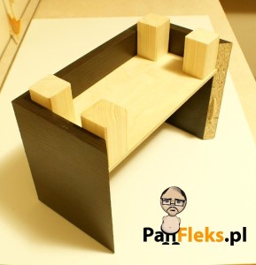 Krótkiego opisu wymaga jeszcze wykończenie skrzynki. Docięliśmy poprzednio 4 odcinki świerkowej kantówki, które wykorzystamy jako nóżki. Przed zamocowaniem oszlifujmy dokładnie elementy i pokryjmy je lakierem bezbarwnym. Wystrój kuchni Pana Fleksa sprawił, że w tym konkretnym przypadku Pan Fleks postanowił pozostawić drewno w naturalnym kolorze – nic nie stoi na przeszkodzie, aby pomalować je na inny kolor.