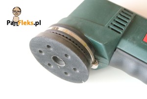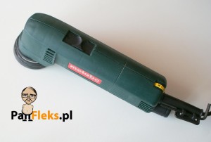 Pora na badanie organoleptyczne: bardzo wygodny uchwyt: od spodu wykończony antypoślizgową okładziną, z wygodnie umieszczonym na górze narzędzia, szerokim włącznikiem. Stopa szlifierska okrągła, więc teoretycznie niemożliwe będzie szlifowanie zakamarków. Ma za to rewelacyjny dodatek – rodzaj gąbki z rzepem, który po zamocowaniu do stopy powoduje, że łatwo pracuje się z nieregularnymi powierzchniami: