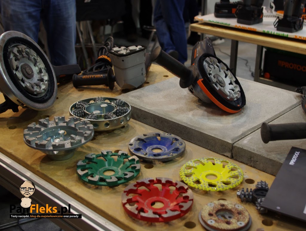 Protool – pamiętacie opisywanego niedawno Festoola? Otóż Protool to bliźniacza marka dedykowana cieślom. Podobnie jak w przypadku Festoola, kupując maszynę z logo Protoola, możemy liczyć na nowatorskie rozwiązania i bardzo wysoką jakość. Z ciekawostek obecnych na targach warto wspomnieć o 4-ro biegowych akumulatorówkach (najlższejszych w swojej klasie) oraz systemie do szlifowania kamienia i betonu: