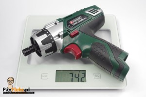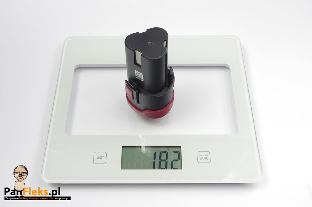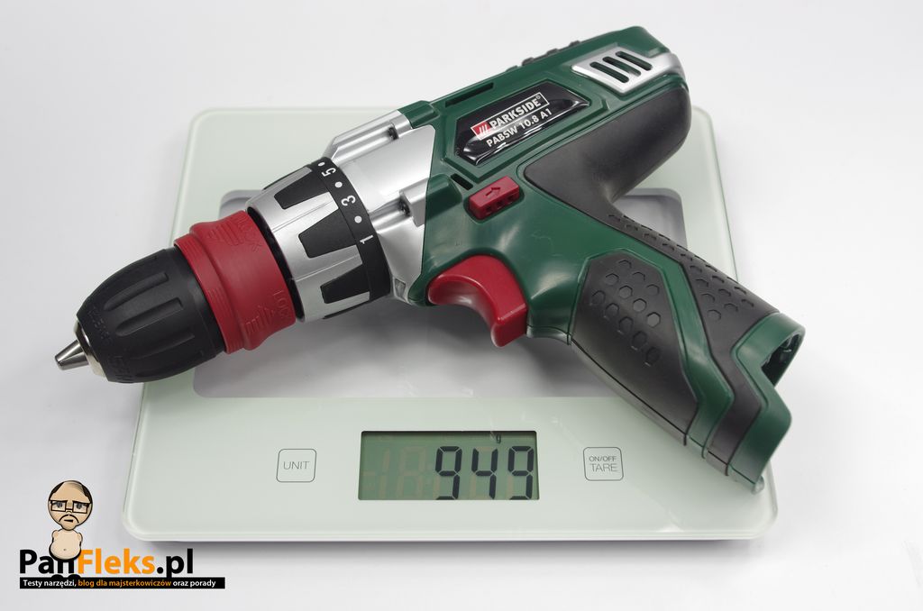 Wkrętarka jest stosunkowo ciężka. Waży bez akumulatora niespełna 950 gramów. 100 gramów więcej waży niebieski Bosch, z akumulatorem 14,4V. Jest także spora, a jej wymiary sugerują, że to wiertarka zasilana ogniwami większymi, niż 10,8V. Całość, z akumulatorem i uchwytem to ponad 1,1kg.