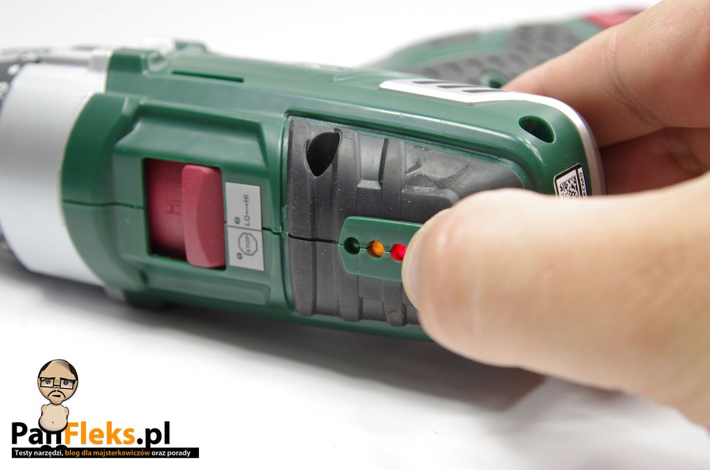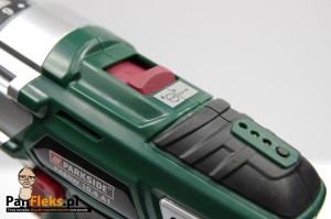 Miłym dodatkiem jest także wskaźnik naładowania akumulatora. Niestety, jest on tandetny jak noszone do sandałów skarpetki. W droższych narzędziach poziom naładowania baterii możemy skontrolować na samym akumulatorze, bądź informuje nas o tym linijka w obudowie. Parkside też ma ją w obudowie, ale jest średnio funkcjonalna. W moim egzemplarzu na świeżo naładowanych akumulatorze zielona dioda lekko się żarzy.Wykonanie wskaźnika i wystający przycisk mikroswitcha też nie przekonuje nas, że to wyjątkowo dobrze zaprojektowane narzędzie.
