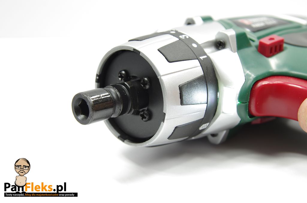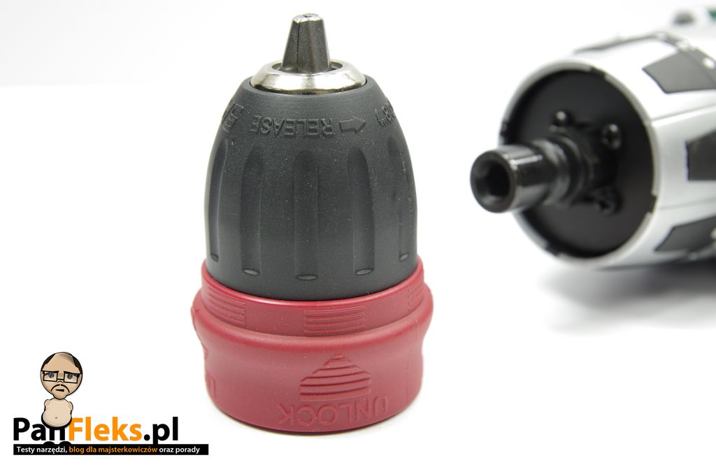Nowością w takim tanim narzędziu jest zdejmowany uchwyt szybkozaciskowy. Taki patent – bardzo wygodny i usprawniający pracę, był dodawany jedynie do droższych narzędzi: miały go, np. wkrętarki Festoola i Metabo. Jest to bardzo przydatny gadżet, szczególnie, gdy praca wymaga wielokrotnej zmiany bita na wiertło i odwrotnie. Za takie rozwiązanie także plus dla Parkside.