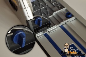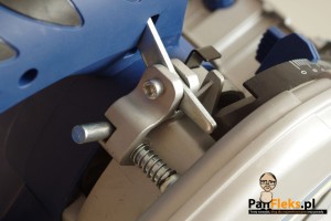 | Specjalne ograniczniki na mimośrodach umożliwiają zamocowanie podstawy pilarki w szynie, w ten sposób, aby nie zbaczała z zadanej linii cięcia. |