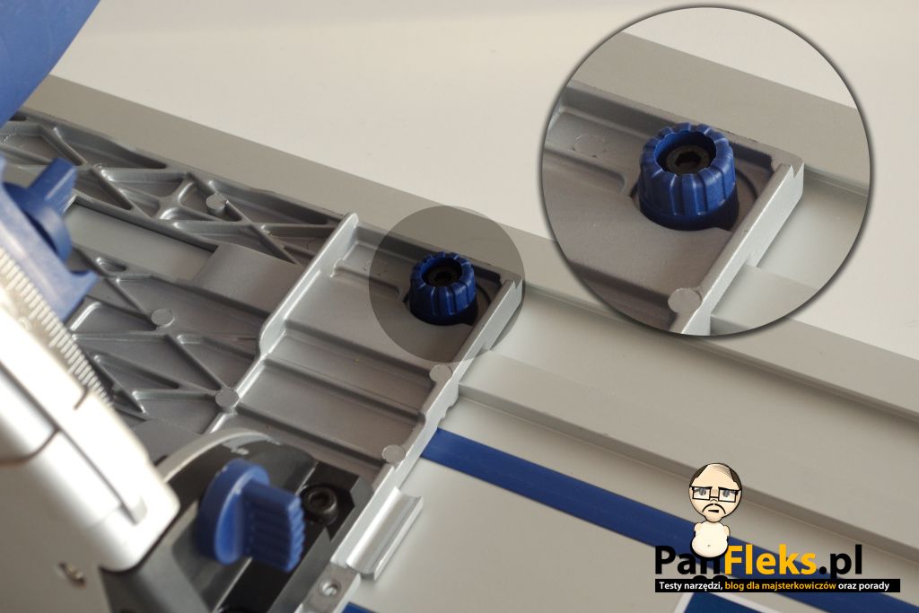 | Specjalne ograniczniki na mimośrodach umożliwiają zamocowanie podstawy pilarki w szynie, w ten sposób, aby nie zbaczała z zadanej linii cięcia. |