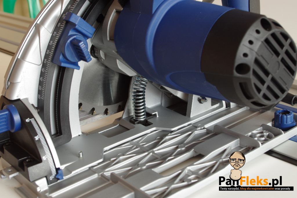 Wróćmy na chwilę do pytania z pierwszej części tekstu: czy za cenę znacznie niższą od markowych odpowiedników otrzymamy narzędzie o zadowalającej jakości wykonania? Pierwszą rzeczą, którą zobaczymy po rozpakowaniu narzędzia, to fakt, że stopa zagłębiarki nie opiera się stabilnie o szynę, lecz kolebie się na boki. Jest to z pewnością wada wynikająca z braku płaskości podstawy pilarki, bądź niedoskonałości szyny. W mało precyzyjnych pracach nie jest to aż tak bardzo dokuczliwe, ale przecież wykorzystujemy zagłebiarkę właśnie po to, aby otrzymać bardzo dobry efekt końcowy.